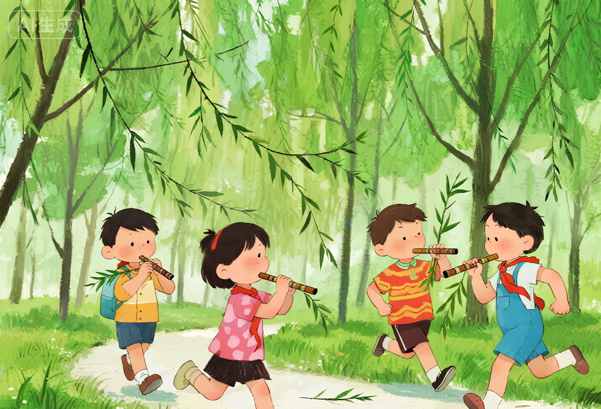 当我们每个人都制作出柳笛后,便开始自行吹奏起来。由于大家制作的柳笛长短粗细不同,因而吹奏出的声音也各不相同,粗长的低沉浑厚,细短的清脆响亮,有的如同小鸟叫,有的恰似青蛙鸣,有的像是婴儿啼哭,有的仿若公鸡打鸣……无论是怎样的声响,大家都乐此不疲地吹奏。吹了一会儿,有人提议进行比赛,或看谁一口气吹得时间长,或看谁吹的声音最响亮。不过,最高兴的还是大家一起合奏,先选定一支大家都会哼唱的曲子,然后由一位“指挥员”下达“预备——齐”的口令,大家便一同吹响,虽然吹出来的未必是那样的曲调。